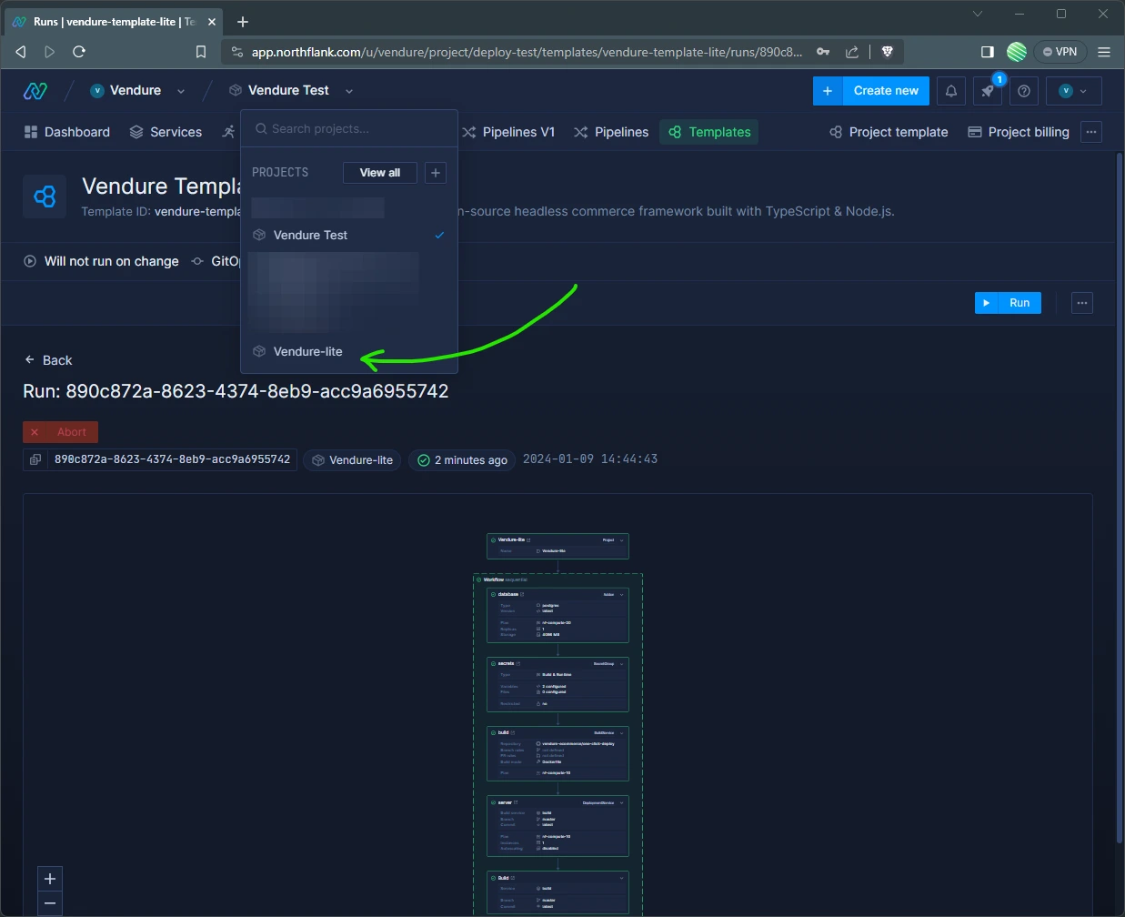 Once the template run has completed, you should be able to see the newly-created project in the project selector.